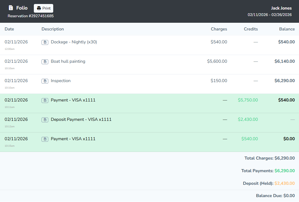 Every stay gets a real-time folio showing dockage, storage, services, and running balances as they happen. See costs accumulate instantly while the boat is still on site.